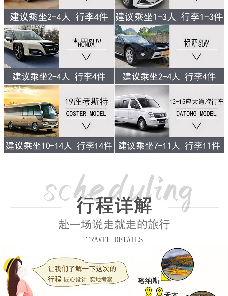 根據參團人數調派車型,保證一人一正座